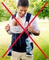 · Il faut que sa position soit physiologique c'est-à-dire que ses jambes soient plus hautes que ses fesses (position de la grenouille), c’est d’ailleurs la position naturelle du bébé lorsque vous le portez à même les bras. Il ne doit pas être suspendu par ses parties génitales, et de ce fait nous déconseillons de porter bébé face au monde, ce qui est plus stressant pour lui d’une part, et d’autre part, sa position physiologique n’est encore une fois pas respectée.